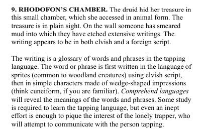 This adventure is tough to review, as I said. It was easy for me to rank, middle of the pack. In a tier list format, a solid B tier adventure. I’d be happy to include it anywhere I needed an old druid grove, and be satisfied with it. But it doesn’t excite me all that much, either positively or negatively. I don’t really want to belabor the point here. It’s clear the Patrick Dolan put effort into this and is a competent designer and writer. I feel quite bad that I don’t have more to say. I do really like the Trapper that the old druid taught to speak with a special tapping language and that the players can figure out how the language works with some gumption (and a healthy dose of Comprehend Languages).